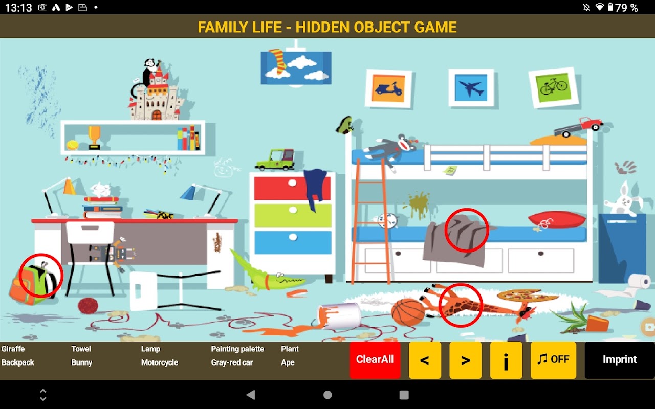अपने लिविंग रूम और अपने बच्चों के कमरे में छिपी हुई वस्तुओं को खोजें (2 कमरे उपलब्ध हैं)। खेल क्षेत्र के नीचे सूचीबद्ध आइटम हैं जिन्हें आपको खोजना है। खेल में अजीब हास्य संगीत शामिल है।