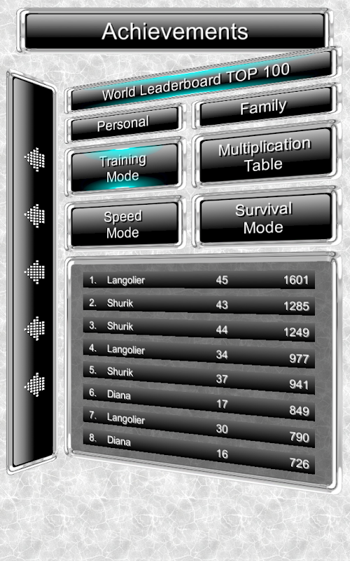 सभी परिवार के सदस्य अपनी प्रोफ़ाइल का उपयोग करके फ़ैमिली मैथ खेल सकते हैं। और फ़ैमिली मैथ प्रत्येक खिलाड़ी के परिणामों को उपलब्धियों वाले अनुभाग में सहेज लेगा। तो आप पारिवारिक टूर्नामेंट सेट कर सकते हैं।