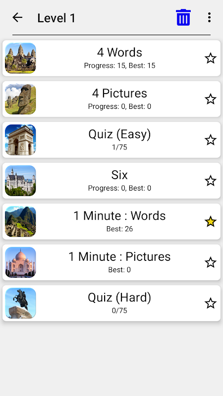 यह 155 प्रसिद्ध स्मारकों और इमारतों के बारे में एक चित्र प्रश्नोत्तरी है। दुनिया भर से मानव निर्मित संरचनाओं - पुल और टावर, मंदिर और मूर्तियों - के नामों का अनुमान लगाएं। गीज़ा के महान पिरामिड और वाशिंगटन स्मारक से लेकर पीसा के झुके हुए टॉवर और सिएटल में स्पेस नीडल तक। स्मारकों को कठिनाई के 2 स्तरों में विभाजित किया गया है। 1) वे जिनका अनुमान लगाना आसान है: जैसे पेरिस में एफिल टॉवर और न्यूयॉर्क में स्टैच्यू ऑफ़ लिबर्टी। 2) स्मारक जो केवल अनुभवी यात्रियों को ही ज्ञात हैं: मेरिडा (स्पेन) का रोमन थिएटर, करेलिया (रूस) में किज़ी पोगोस्ट और फ्लोरेंस (इटली) में उफ़ीज़ी। गेम मोड चुनें: 1) वर्तनी प्रश्नोत्तरी (आसान और कठिन) - अक्षर दर अक्षर शब्द का अनुमान लगाएं। 2) बहुविकल्पीय प्रश्न (4 या 6 उत्तर विकल्पों के साथ)। यह याद रखना महत्वपूर्ण है कि आपके पास केवल 3 जीवन हैं। 3) टाइम गेम (1 मिनट में जितने हो सके उतने उत्तर दें) - आपको एक स्टार पाने के लिए 25 से ज़्यादा सही उत्तर देने चाहिए।