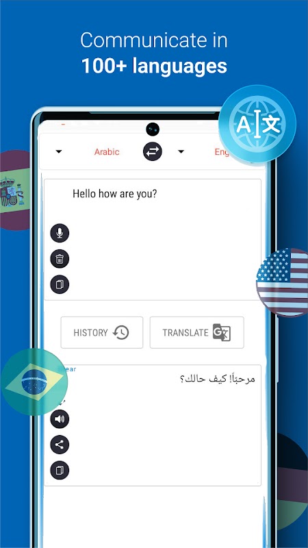 विश्व की सभी भाषाएँ बोलें और अनुवाद करें। तत्काल और आसानी से सुलभ अनुवाद। आसानी से भाषाएँ सीखें और दुनिया में सभी के साथ संवाद करें। अपने अनुवादों को सीधे त्वरित संदेश, नोट्स, सोशल नेटवर्किंग, मेल, खोज इंजन, या अपने डिवाइस पर इंस्टॉल किए गए किसी भी एप्लिकेशन के साथ साझा करें।