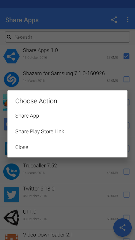 शेयर एप आपके एप साझा करने की कई विधियां प्रदान करता है, आप एप को संदेश, ईमेल, ब्लूटूथ, व्हाट्सएप, फेसबुक मैसेंजर ... आदि के रूप में भेज कर साझा कर सकते हैं।