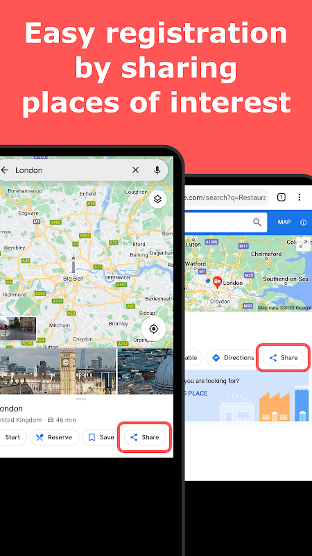 - मैप ऐप्स और वेब खोज परिणामों से इस ऐप के साथ स्थान डेटा साझा करके आसानी से पंजीकरण करें।