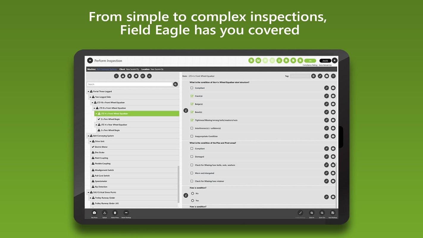 फील्ड ईगल के पुरस्कार जीतने वाले मोबाइल सुरक्षा ऑडिट और निरीक्षण प्रबंधन सॉफ्टवेयर के साथ, कोई भी विंडोज 10, आईओएस या एंड्रॉइड टैबलेट पूरी तरह से एकीकृत डेटा संग्रह उपकरण हो सकता है। फील्ड ईगल को नियामक अनुपालन सुनिश्चित करने, संभावित समस्याओं की पहचान करने, निरीक्षण बढ़ाने और दक्षता की रिपोर्ट करने और सटीकता और उच्च गुणवत्ता वाले डेटा सुनिश्चित करने के लिए डिज़ाइन किया गया है।