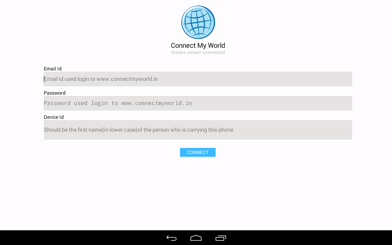 * इस ऐप को इंस्टॉल करने से पहले http://connectmyworld.in के साथ एक खाता होना आवश्यक है, यह एक खाता बनाने के लिए स्वतंत्र है, इस ऐप के लिए अपना परीक्षण शुरू करने के लिए पंजीकरण करना बहुत आसान और बहुत तेज़ है।