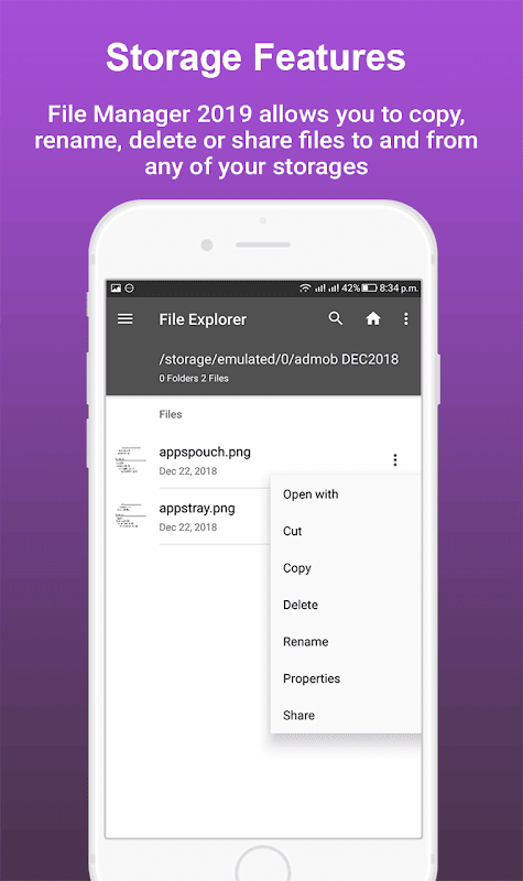 File manager 2019 is cool and powerful file explorer for smart phones. It’s totally free, fast and full-featured. Manage and arrange your files using this file explorer just like you do on your pc or laptop.