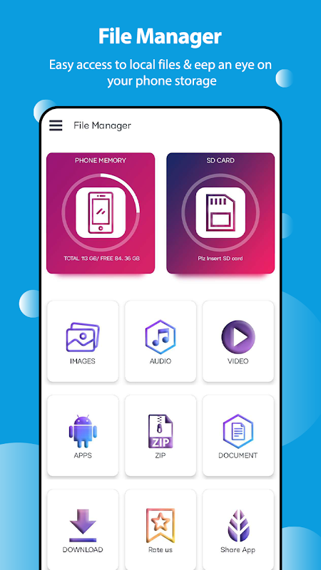 सभी फाइलें अब मोबाइल सिस्टम में छिपी नहीं हैं। फ़ाइल प्रबंधक आपको फ़ाइल खोजने, फ़ाइल को आसानी से वर्गीकृत करने में मदद करेगा। यह कई शानदार सुविधाओं का भी समर्थन करता है: वैश्विक खोज, चलती, हटाना, खोलना, और फ़ाइलें साझा करना, साथ ही नाम बदलना, खोलना और कॉपी-पेस्ट करना।