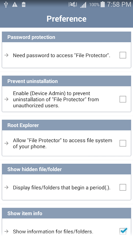 - Password protection to access "File Protector", user can also enable (Device Admin) to prevent uninstallation from unauthorized users.