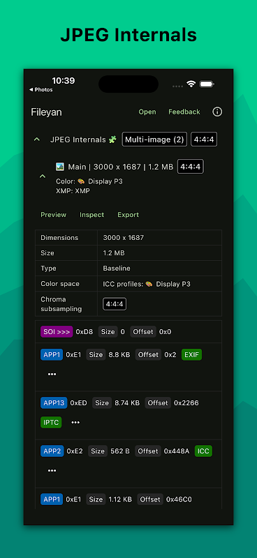 यह निर्माण समय, जीपीएस स्थान, कोडेक, आयाम, फ्रेम दर (एफपीएस), अवधि, प्रोफ़ाइल, स्तर, एनकोडर, EXIF मेटाडेटा, कंटेनर प्रारूप, बिटरेट, डिवाइस जानकारी, कैमरा जानकारी, एपर्चर, फोकल लंबाई, शटर स्पीड जैसी जानकारी दिखा सकता है। , आईएसओ, एक्सपोज़र बायस, एचडीआर, एचडीआर10+, डॉल्बी विज़न, गेन मैप्स, एक्सएमपी, मेगापिक्सेल गिनती, कलर स्पेस, कलर ट्रांसफर, कलर प्राइमरीज़, बिट डेप्थ, पिक्सेल फॉर्मेट, सैचुरेशन, शार्पनेस, डेप्थ इन्फो, 360 वीडियो, स्थानिक वीडियो, लाइव फ़ोटो, मोशन फ़ोटो, आईसीसी प्रोफ़ाइल, सहायक डेटा, ऑडियो जानकारी, नमूना दर आदि।