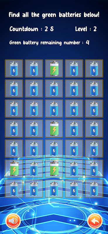 इस गेम में 7 पंक्तियों और 5 कॉलम में 35 बैटरी कार्ड होते हैं। आपको गेम की शुरुआत में उल्टी गिनती के 3 सेकंड के भीतर सभी हरी बैटरियों की स्थिति याद रखनी होगी। फिर सभी कार्ड ब्लॉक हो जाते हैं। उल्टी गिनती के 20 सेकंड के भीतर कार्ड पर क्लिक करें। जब आप नीली बैटरी वाले कार्ड पर क्लिक करते हैं तो गेम खत्म हो जाता है। सभी हरी बैटरियाँ ढूँढ़ें और अगले स्तर में प्रवेश करें। जैसे-जैसे स्तरों की संख्या बढ़ती है, हरी बैटरियों की संख्या भी बढ़ती जाती है। गेम की उल्टी गिनती, स्तर और शेष हरी बैटरियों की संख्या स्क्रीन के शीर्ष पर प्रदर्शित होती है।