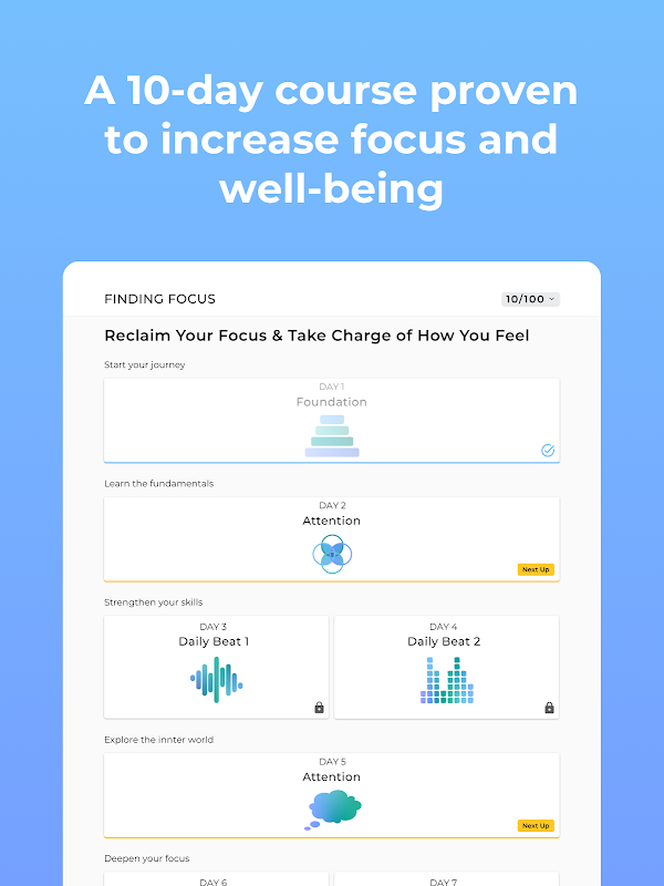 जैसे-जैसे दुनिया अधिक से अधिक विचलित होती जाती है, आपकी ध्यान केंद्रित करने की क्षमता का प्रशिक्षण आपको अलग कर सकता है। फोकस खोजने से आपको कम तनाव के साथ अधिक काम करने में मदद मिलती है। यूटी ऑस्टिन के वैज्ञानिकों द्वारा बनाया गया। पाँच वर्षों के विश्वविद्यालय अनुसंधान द्वारा समर्थित।