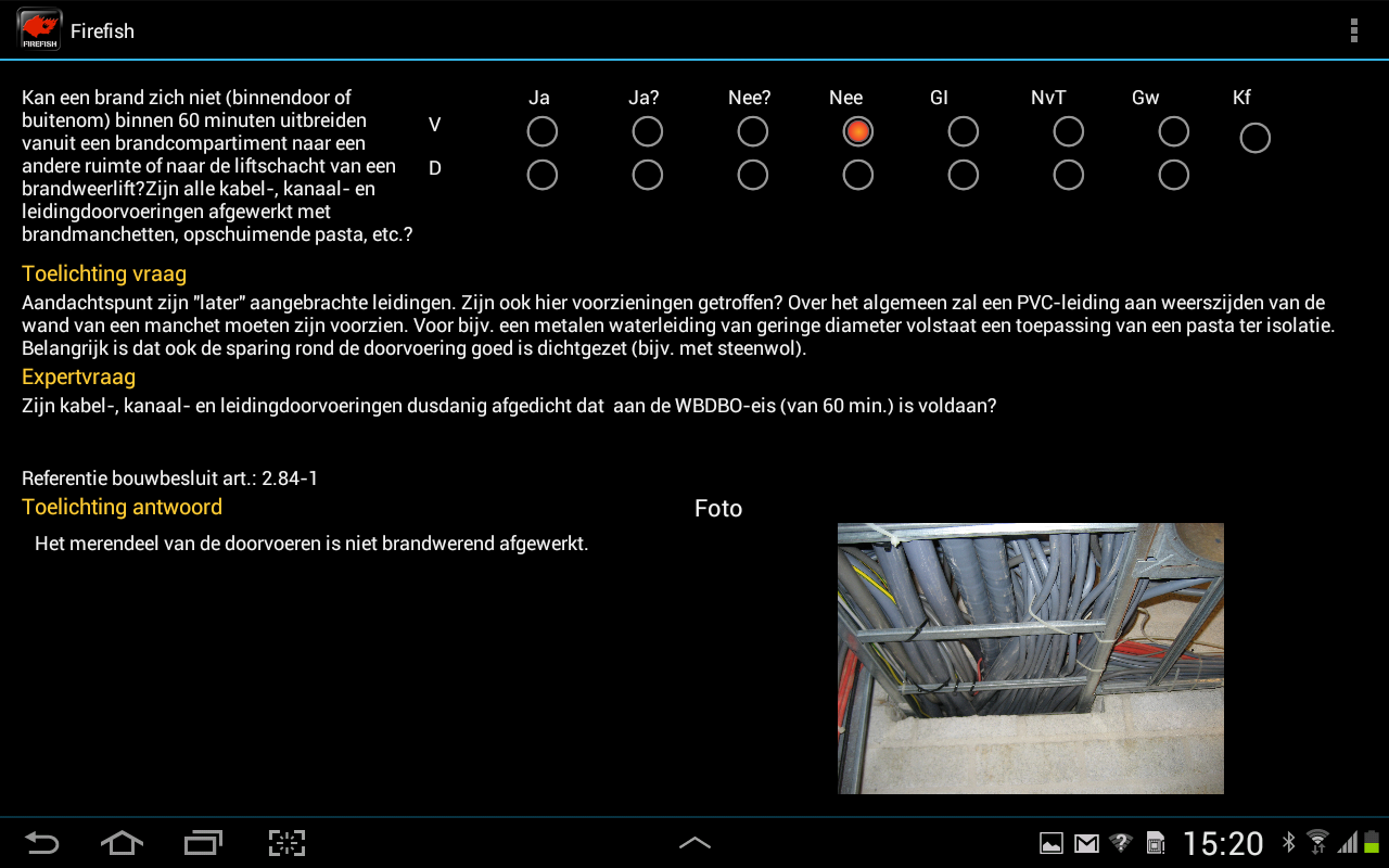 FIREFISH is gebaseerd op de meest recente eisen (Bouwbesluit 2012). Naast wettelijke eisen worden ook compenserende maatregelen meegenomen in de app. Zo wordt een compleet beeld verkregen van de brandveiligheidssituatie van het zorggebouw.