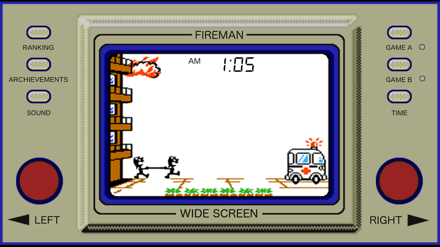 Salva a los vecinos de un incendio, demuestra que eres un héroe. Homenaje a las consolas portátiles Game & Watch de los 80.