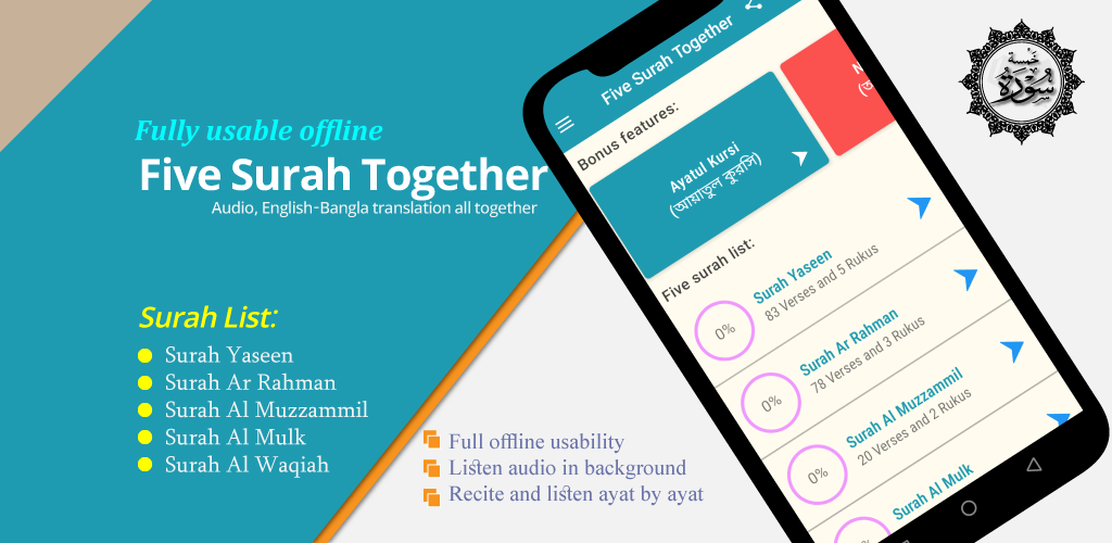 ऑफ़लाइन ऑडियो और अनुवाद ऐप के साथ पांच सूरह एक इंटरैक्टिव यूआई डिज़ाइन के साथ बनाया गया है। हमने कुरान के पांच सबसे अधिक पढ़े जाने वाले और सबसे आम सूरह जोड़े। इतना ही नहीं हमने अंग्रेजी और बंगाली अनुवाद भी जोड़े हैं ताकि उपयोगकर्ता इन्हें आसानी से समझ सकें। प्रत्येक सूरह में एक अलग बचत विकल्प होता है इसलिए यह आपके सूरह-ऑडियो प्लेइंग इतिहास को स्वचालित रूप से सहेजता है। जब आप सूरा सुनने के लिए वापस आएंगे तो यह वहीं से शुरू होगा जहां आपने छोड़ा था। सुरा को फिर से शुरू से पुनः आरंभ करने का एक और विकल्प है।