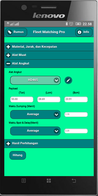 आवेदन मिलान की गणना करने के बेड़े भारी उन्हें लोड उत्पादकता उपकरण, उत्पादकता उपकरण परिवहन, और परिवहन के लिए की जरूरत है, सामग्री दूरी hauling पर आधारित है।