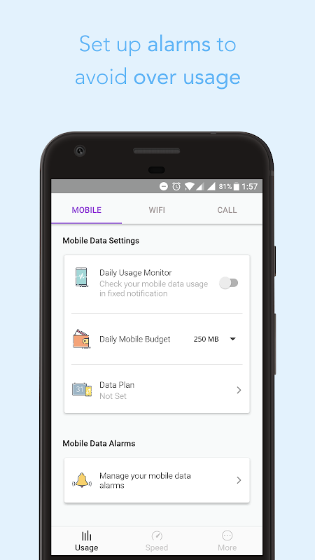 • Alarms - Set up alarms to avoid data wastage and overuse charges. The smartest save data app.