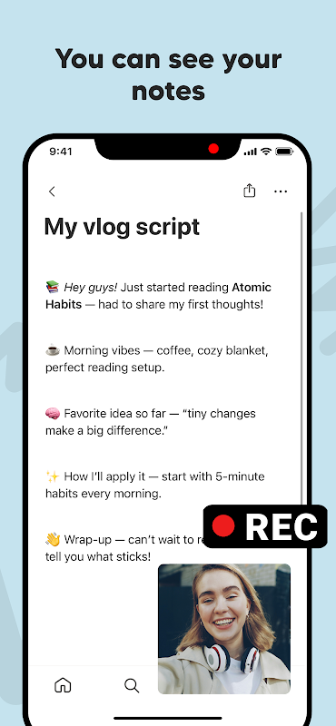 • 🧠 रिकॉर्डिंग करते समय अपने नोट्स देखें: रचनाकारों, व्लॉगर्स, छात्रों या स्क्रिप्ट पढ़ने वाले किसी भी व्यक्ति के लिए आदर्श।