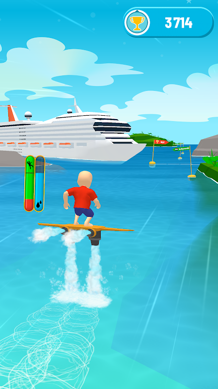 Tap and hold the screen to feed the water into your jet board and make your Flysurf Sky! dash faster and farther! Don’t forget to release your hold when the vibration is too high – otherwise it’s game over!