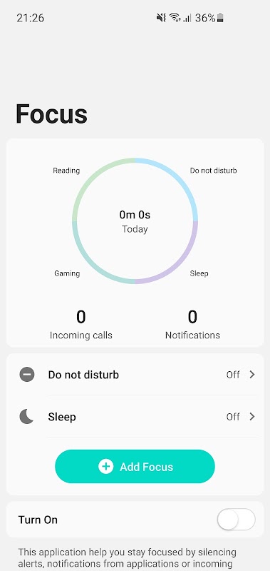 यह एप्लिकेशन आपको अलर्ट, एप्लिकेशन या इनकमिंग कॉल की सूचनाओं को मौन करके ध्यान केंद्रित करने में मदद करता है।