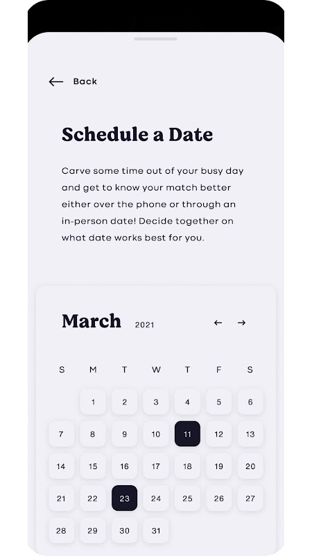 उद्योग-प्रथम, "एक तिथि निर्धारित करें" इंटरैक्टिव सुविधा जो मेल खाने वाले उपयोगकर्ताओं को एक साफ, उपयोग में आसान स्क्रीन में पसंदीदा दिन और समय दिखाते हुए एक तिथि निर्धारित करने का विकल्प प्रदान करती है।