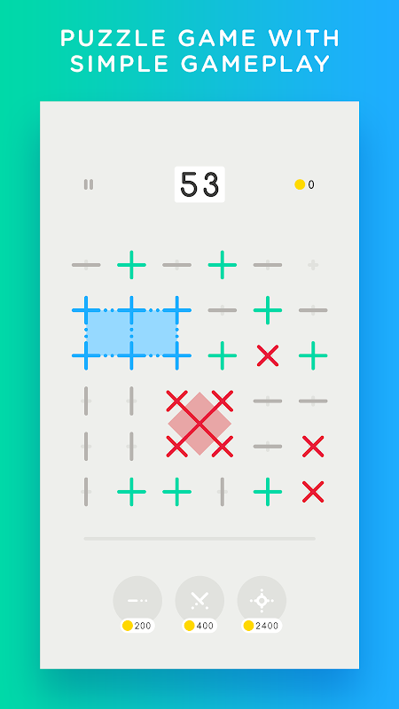 ऊर्ध्वाधर और क्षैतिज रेखाओं को गठबंधन करने के लिए स्वाइप करें और plusses प्राप्त करें। चार वर्गों को एक वर्ग के बने पिंजरे में मिलाएं और उन्हें हटाने के लिए दो बार टैप करें। प्रत्येक 5 चाल के बाद, एक क्रॉस स्पॉन्स और चीजों को कठिन बना देता है। उन्हें प्लस पिंजरों की तरह हटा दें। खेल समाप्त होता है जब ग्रिड पर कोई चाल नहीं छोड़ी जाती है। आप बोनस गेम के साथ और अधिक सिक्के कमा सकते हैं जो आप हर दिन खेल सकते हैं।