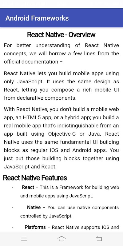 इस एप्लिकेशन में स्पष्टीकरण के साथ सभी सामग्रियों के साथ सभी प्रकार के एंड्रॉइड फ़्रेमवर्क शामिल हैं।