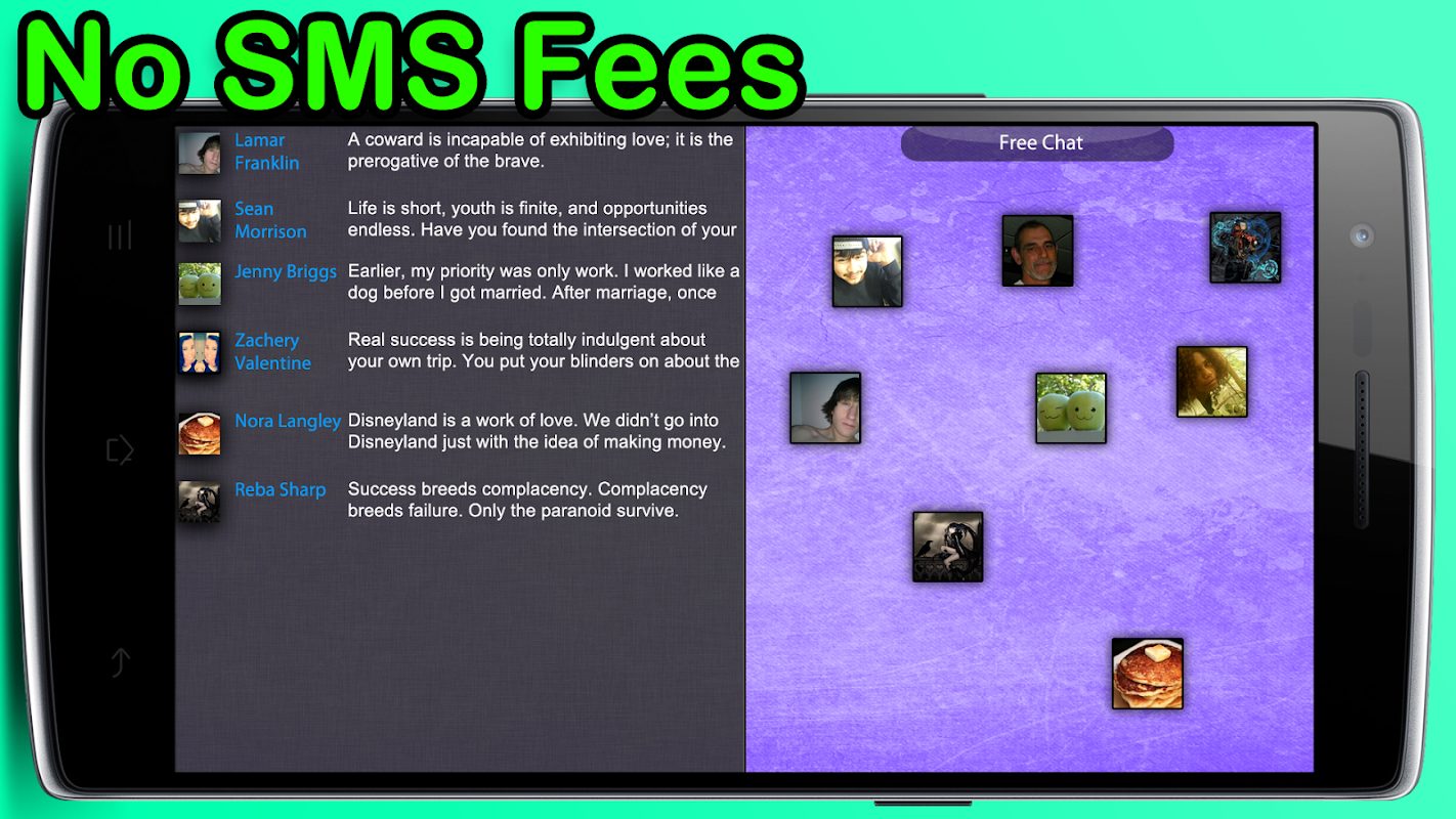 Download Free Chat today to talk with people, and make new friends from around the world. Free Chat is 100% free to use; all you need is a data plan or WiFi, and you can chat within seconds. Tired of paying for SMS? Use Free chat to send free SMS push messages to friends that also use Free Chat. Sign-up takes 10 seconds, and even faster if you use Facebook. So what are you waiting for? Download Free Chat today, and start chatting now!