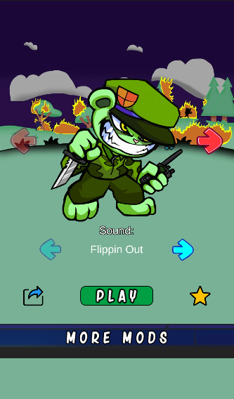 FNF Flippy Mad Mod Test में आप अपनी खुद की अनूठी सुपरहिट रचना कर सकते हैं। यह कैसे करना है? डिवाइस के टैप पर बटन दबाएं। यह फ़्लिपी मैड को गाएगा और एक निश्चित तरीके से आगे बढ़ेगा। बटन का प्रत्येक प्रेस नायक को एक अलग तरीके से आगे बढ़ने और गाने के लिए प्रेरित करता है। इसके अलावा, आप अलग-अलग गाने चुन सकते हैं, जिसके आधार पर आप अपनी सुपरहिट रचना करेंगे। इसलिए, आपके पास हर बार अद्वितीय ट्रैक बनाने का एक शानदार अवसर है और इसमें फ्लाईपी मैड आपकी मदद करेगा।
