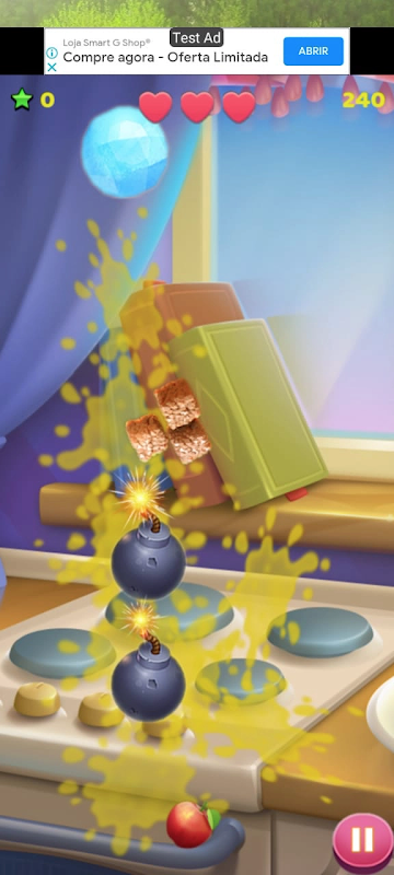 Avaliação: Corte tudo sem deixar nada cair, se cair mais de 3 alimentos você perde o jogo, tome cuidado com as bombas.