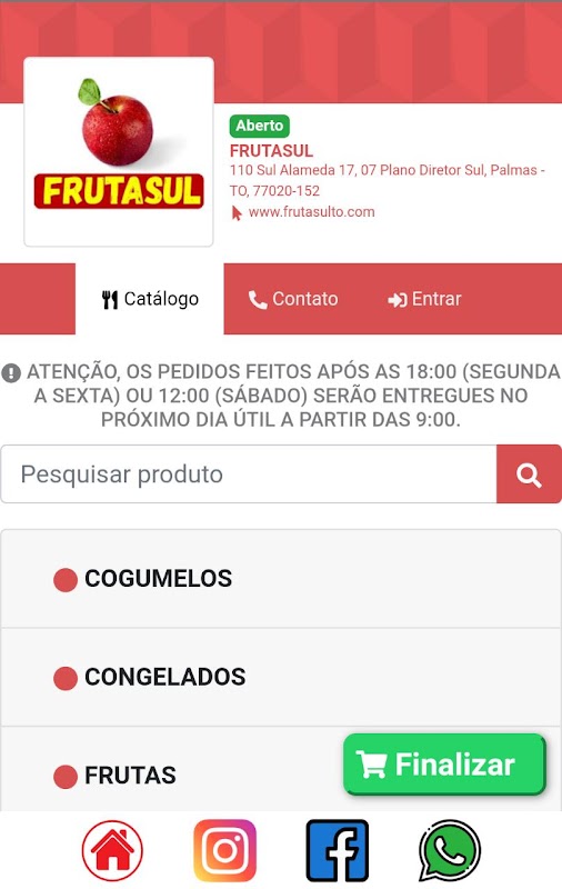 Ao abrir o aplicativo você deverá escolher o bairro onde deseja receber seu pedido, feito isso, você poderá escolher os produtos desejados separados por categoria.
