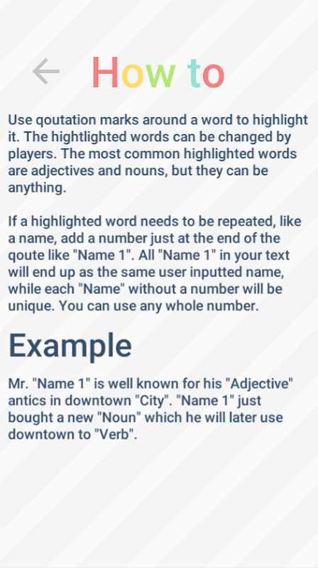 अगर आपको इस तरह का गेम पसंद है, तो मेरा सुझाव है कि आप ओरिजिनल Mad Libs™ किताबें खरीदें। उनके पास कुछ बहुत ही मज़ेदार टेक्स्ट हैं!