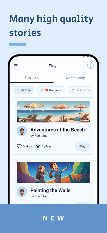 🔹 रेडीमेड कहानियाँ खेलें: हमारी मजेदार टीम द्वारा तैयार की गई डिफ़ॉल्ट कहानियों के हमारे मज़ेदार संग्रह में गोता लगाएँ! बस रिक्त स्थान भरें, और जादू को प्रकट होते देखें!