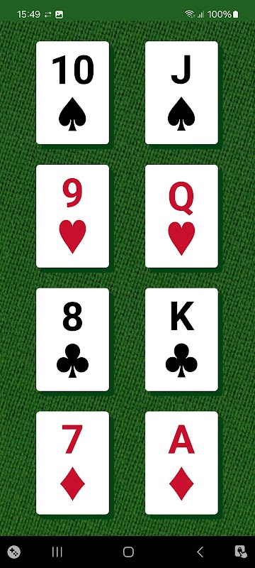 1. अगर स्क्रीन पर सभी कार्ड एक ही सूट के हैं, तो उस सूट का कार्ड पूर्ण मिलान नहीं है। अगर स्क्रीन पर सभी कार्ड का मूल्य समान है, तो उस मूल्य का कार्ड पूर्ण मिलान नहीं है।