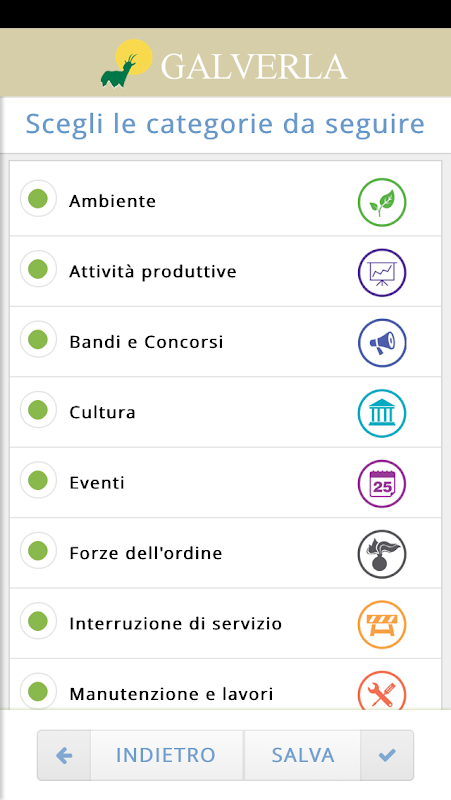 ● Puoi scegliere quali categorie di informazioni seguire: ambiente, cultura, eventi, mobilità, notizie e informazioni, pubblica sicurezza, scuola, sport, sanità, politica, e tanto altro, così ricevi le news solo di ciò che ti interessa!