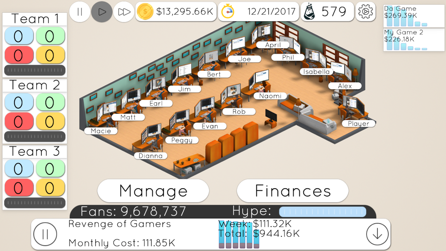 - अपने स्टूडियो के हर विस्तार का प्रबंधन! कर्मचारियों किराया, 3 अलग-अलग टीमें बना, निवेशकों को हो रही द्वारा पैसे जुटाने और खेल, शान्ति, और अधिक बनाने के लिए!
