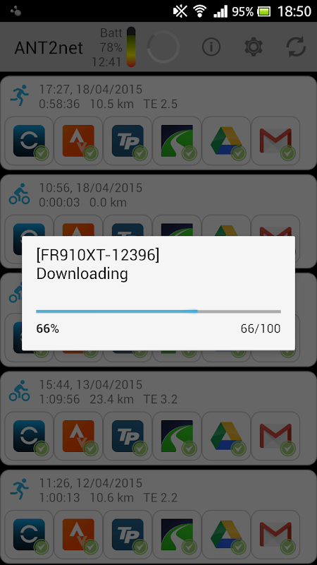 The first time you use the app you will need to configure the services you use and download all the activities stored in your ANT+ device. The download may take a long while depending on how many activities keeps your device.