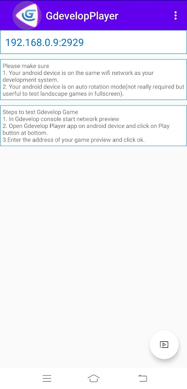 यह ऐप जीडेवलप गेम डेवलपर को पूर्ण स्क्रीन पर एंड्रॉइड डिवाइस पर गेम का परीक्षण करने की अनुमति देता है।