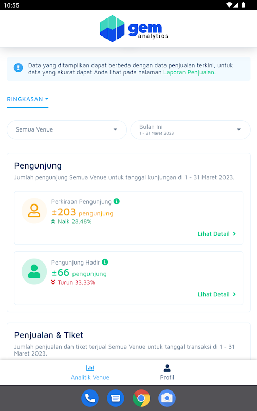 2. जीईएम एनालिटिक्स ऐप में एनालिटिक्स "पेनजुआलन टिकट" शामिल है। केताहुई टोटल टिकट टेरजुअल, बेसर्टा परसेंटेज केनाइकन या पेनुरुनन पेनजुअलन दारी वक्त के वक्त।