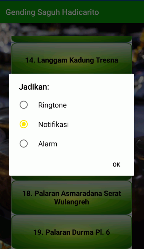 जावानीस गेंडिंग सॉन्ग सगुह हदिकारिटो एप्लिकेशन प्रस्तुत किया गया है जिसमें प्रसिद्ध जावानीस कलाकार, कि सगुह हदिकारिटो के बेहतरीन काम शामिल हैं जैसे कि एडा 2 गागरक मातरम म्लेबेट अयाक-एन कंटीन्यू स्रेपेग दादोस पलारान सेकर पंगकुर स्ल.9