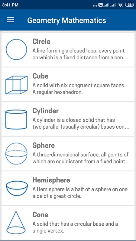 ज्यामिति के लिए यह आवेदन हमें इयूक्लिडियन ज्यामिति की अवधारणाओं के बारे में स्पष्ट विचार देता है. ज्यामितीय आंकड़े, भाव और अन्य महत्वपूर्ण पैरामीटर के बारे में सभी संबंधित है. इस आवेदन के सभी त्रिभुज, आयत, वर्ग, घन, सर्किल, क्षेत्र, गोलार्ध और शंकु के बारे में जानने के लिए सभी मानकों के छात्रों की मदद. इस आवेदन के बारे में एक अन्य महत्वपूर्ण लाभ यह है कि यह स्पष्ट रूप से परिधि, क्षेत्र, खंड और सभी ज्यामितीय figures.This समकोण त्रिभुज के लिए पाइथागोरस प्रमेय बताते हैं की अन्य महत्वपूर्ण मापन जैसे विभिन्न ज्यामितीय मापदंडों को खोजने के लिए फार्मूले सौदों है. हम ज्यामिति के लिए इस आवेदन के सभी ज्यामितीय शिक्षार्थियों के लिए एक बहुत ही शानदार जेब संदर्भ है उम्मीद है.