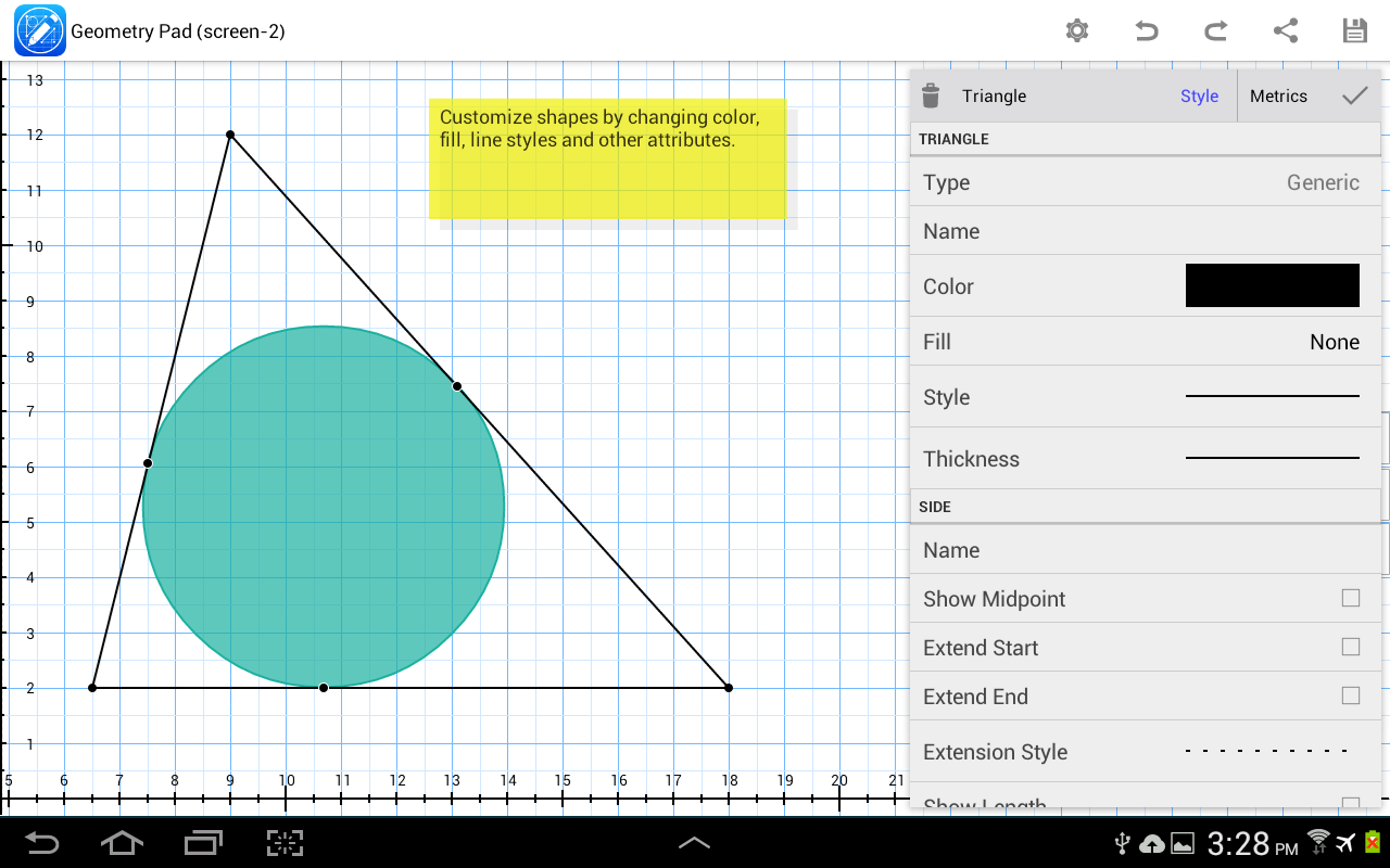 ज्यामिति पैड से आप मौलिक ज्यामितीय आकृतियाँ बना सकते हैं, उनके गुणों का पता लगा सकते हैं और बदल सकते हैं और मैट्रिक्स की गणना कर सकते हैं। आकार एक आयताकार समन्वय प्रणाली के साथ एक स्क्रॉल और ज़ूम करने योग्य कार्यपुस्तिका पर प्रदर्शित होते हैं।