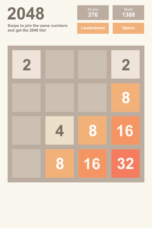 Swipe to move all tiles. Merge two tiles with the same number to a greater number tile.