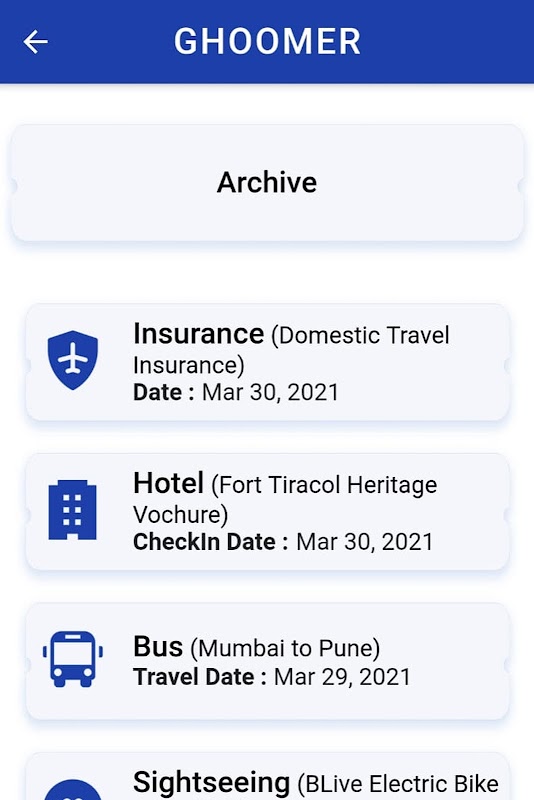 Ghoomer App is a professional travel wallet for travel agents and travelers around the world. With the help of this app Travel Agents can upload Flight, Railway, Bus, Hotel, Packages, Sightseeing, Visa, Insurance, Taxi and other Vouchers and Ticket copies along with their bill.