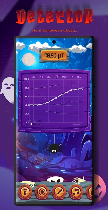 🎃 डिटेक्टर 2: एक डिटेक्टर जो अपने वातावरण में असाधारण गतिविधि का पता लगाने के लिए डिज़ाइन किया गया है, बीच में हृदय गति ग्राफ-शैली डिस्प्ले और शीर्ष पर एक डिजिटल डिस्प्ले है।