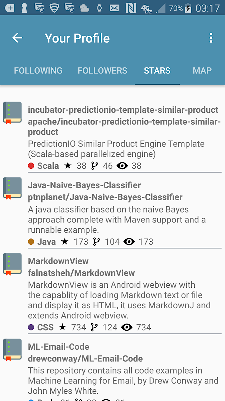 In its main screen you will be able to monitor your daily contribution activity placed in chronological order. Explore your GitHub data such as feed list, repositories, followers list, and starring, watching activity.