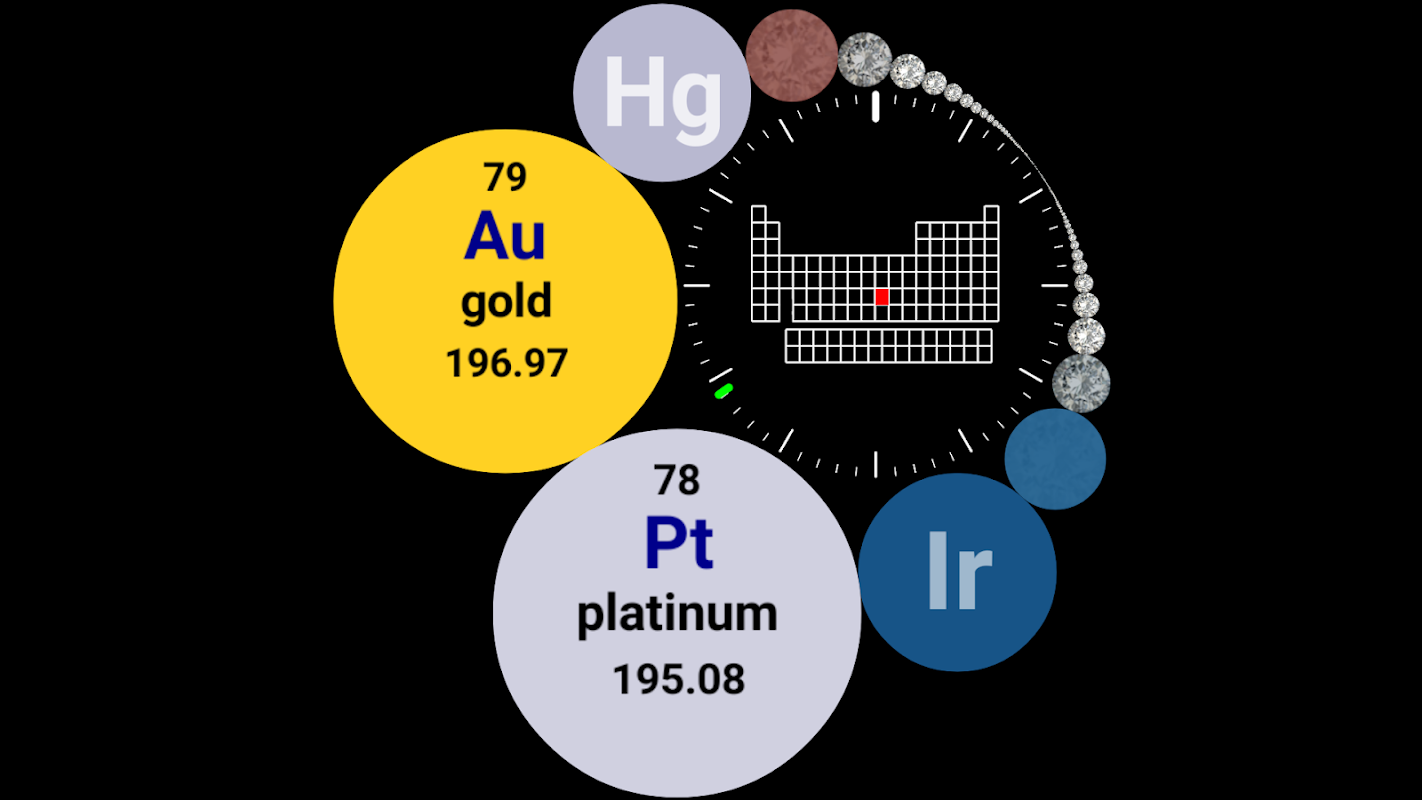 वर्तमान में फ़ोकस में मौजूद तत्व को हाइलाइट करते हुए आवर्त सारणी केंद्र में है।