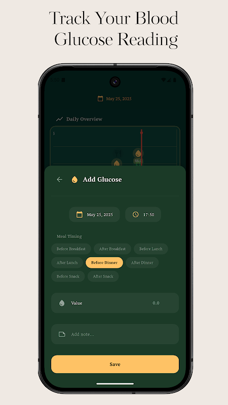 क्या आप अपने ग्लूकोज़ के स्तर को दर्ज करने, अपने आहार के प्रभाव को समझने और अपने स्वास्थ्य के बारे में मूल्यवान जानकारी प्राप्त करने के लिए एक सरल और प्रभावी तरीका खोज रहे हैं? हमारा ब्लड ग्लूकोज़ ट्रैकर ऐप आपके लिए एक बेहतरीन समाधान है! अपने ग्लूकोज़ के स्तर की रीडिंग को आसानी से दर्ज करें और यहाँ तक कि एक ही स्थान पर अपने इंसुलिन की खुराक को भी ट्रैक करें. बिखरे हुए नोटों को अलविदा कहें और हमारे शक्तिशाली ब्लड शुगर मॉनिटर और ब्लड शुगर ट्रैकर के साथ संगठित स्वास्थ्य प्रबंधन को अपनाएँ. हमारा उपयोगकर्ता-अनुकूल इंटरफ़ेस लॉगिंग को त्वरित और आसान बनाता है. चाहे आप ग्लूकोज़ ब्लड शुगर ट्रैकर का उपयोग कर रहे हों या पारंपरिक विधि का, बस अपना डेटा लॉग करें. विस्तृत ब्लड शुगर लॉग बनाए रखें और समय के साथ अपनी प्रगति की स्पष्ट तस्वीर प्राप्त करें. आपकी स्वास्थ्य यात्रा को सशक्त बनाने के लिए मुख्य विशेषताएँ: सरल ग्लूकोज़ ट्रैकिंग: पूरे दिन अपने ब्लड ग्लूकोज़ रीडिंग को सटीक रूप से दर्ज करें. चाहे आप भोजन से पहले, भोजन के बाद या अन्य समय पर निगरानी कर रहे हों, हमारा ट्रैकर रिकॉर्ड-कीपिंग सुनिश्चित करता है. इसे अपने विश्वसनीय ब्लड ग्लूकोज़ मॉनिटर के रूप में उपयोग करें. इंसुलिन ट्रैकिंग: अपने ब्लड शुगर लेवल के साथ-साथ अपने इंसुलिन की खुराक को आसानी से रिकॉर्ड करें. भोजन लॉगिंग को सरल बनाया गया: अपने भोजन का विस्तृत रिकॉर्ड रखें, समय, खाद्य पदार्थ और भाग के आकार को ध्यान में रखें. अपने आहार और ग्लाइसेमिया के बीच संबंध को समझना महत्वपूर्ण है. ग्लाइसेमिक इंडेक्स की शक्ति को अनलॉक करें: एक अंतर्निहित ग्लाइसेमिक इंडेक्स जानकारी तक पहुँचें. सूचित आहार विकल्प बनाने के लिए विभिन्न खाद्य पदार्थों के ग्लाइसेमिक इंडेक्स और ग्लाइसेमिक लोड के बारे में जानें. मैक्रोन्यूट्रिएंट ब्रेकडाउन: बुनियादी भोजन ट्रैकिंग से आगे बढ़ें और कार्बोहाइड्रेट, प्रोटीन, फाइबर और वसा के अपने सेवन को सावधानीपूर्वक लॉग करें. अपने पोषण संतुलन और अपने शर्करा के स्तर पर इसके प्रभाव के बारे में बहुमूल्य जानकारी प्राप्त करें. कस्टम फूड एंट्री: हमारे डेटाबेस में कोई विशिष्ट भोजन नहीं मिल रहा है? कोई बात नहीं! अपने स्वयं के कस्टम खाद्य पदार्थों को आसानी से जोड़ें, जिसमें उनकी पोषण संबंधी जानकारी और ग्लाइसेमिक इंडेक्स शामिल हैं, जो आपके अनूठे आहार के अनुरूप व्यापक ट्रैकिंग सुनिश्चित करता है. लॉग का व्यापक इतिहास: अपने रक्त शर्करा, इंसुलिन और भोजन लॉग के पूर्ण इतिहास तक पहुँचें. दीर्घकालिक रुझानों को समझने और अपने स्वास्थ्य सेवा प्रदाता के साथ बहुमूल्य जानकारी साझा करने के लिए पिछले डेटा की समीक्षा करें. आपका व्यक्तिगत "ग्लूक