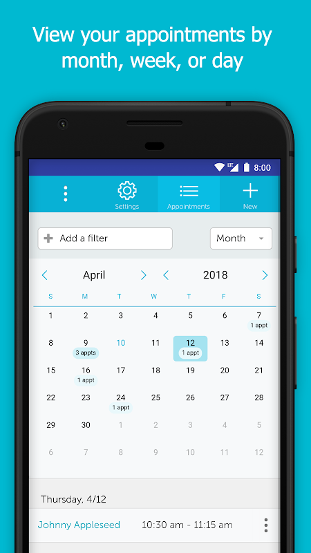 समय बचाएं और नो-शो कम करें! सर्वश्रेष्ठ शेड्यूलर ऐप में त्वरित रूप से अपॉइंटमेंट शेड्यूल करें और क्लाइंट को स्वचालित रूप से ईमेल या टेक्स्ट रिमाइंडर मिलते हैं। ग्राहक आसानी से पुष्टि करते हैं और अपॉइंटमेंट आपके कैलेंडर में iPhone/iPad, आउटलुक और Google कैलेंडर पर और हमारे ऐप में एजेंडा, दिन, सप्ताह और महीने के विचारों के साथ दिखाई देते हैं।"