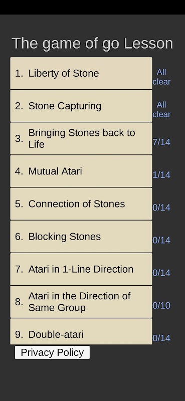 हमने ऐसे प्रश्न शामिल किए हैं जिन्हें पहली बार गो के बारे में सीखना शुरू करने के लिए हल किया जाना चाहिए। इसमें 21 इकाइयाँ और कुल 246 प्रश्न हैं, ताकि शुरुआती लोग पर्याप्त रूप से समस्या समाधान का अभ्यास कर सकें। 1. लिबर्टी ऑफ़ स्टोन 2. स्टोन कैप्चरिंग 3. पत्थरों को वापस जीवन में लाना 4. म्यूचुअल अटारी 5. पत्थरों का कनेक्शन 6. पत्थरों को रोकना 7. 1-लाइन दिशा में अटारी 8. समान समूह की दिशा में अटारी 9. डबल-अटारी 10. अवैध बिंदु 11. को 12. निरंतर अटारी 13. सीढ़ी 14. नेट 15. स्नैपबैक 16. कैप्चर रेस 17. दोहरी ज़िंदगी 18. क्षेत्र/झूठी आँख 19. दो क्षेत्रों का निर्माण/उन्मूलन 20. तटस्थ बिंदु 21. क्षेत्र गणना (गिनती)