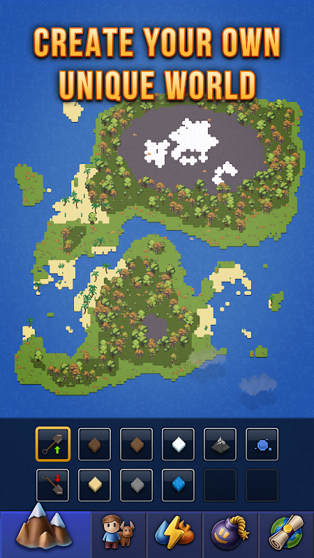 Choose from dozens of tools in God Simulator to create a unique planet, experiment with the sizes and shapes of brushes to edit lands. Have fun in a Sandbox game making your own tropical islands surrounded by endless oceans. Resize the map for easy observation of evolution.