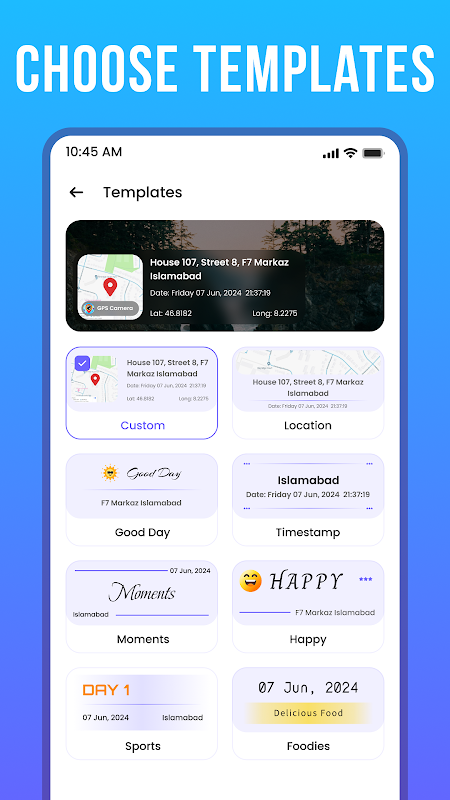 अनुकूलित स्टाम्प: आप अपनी इच्छानुसार अपने स्टाम्प को संपादित कर सकते हैं, जीपीएस कैमरा आपको अपनी तस्वीरों पर स्टाम्प के टेम्पलेट्स का चयन करने की अनुमति देगा।
